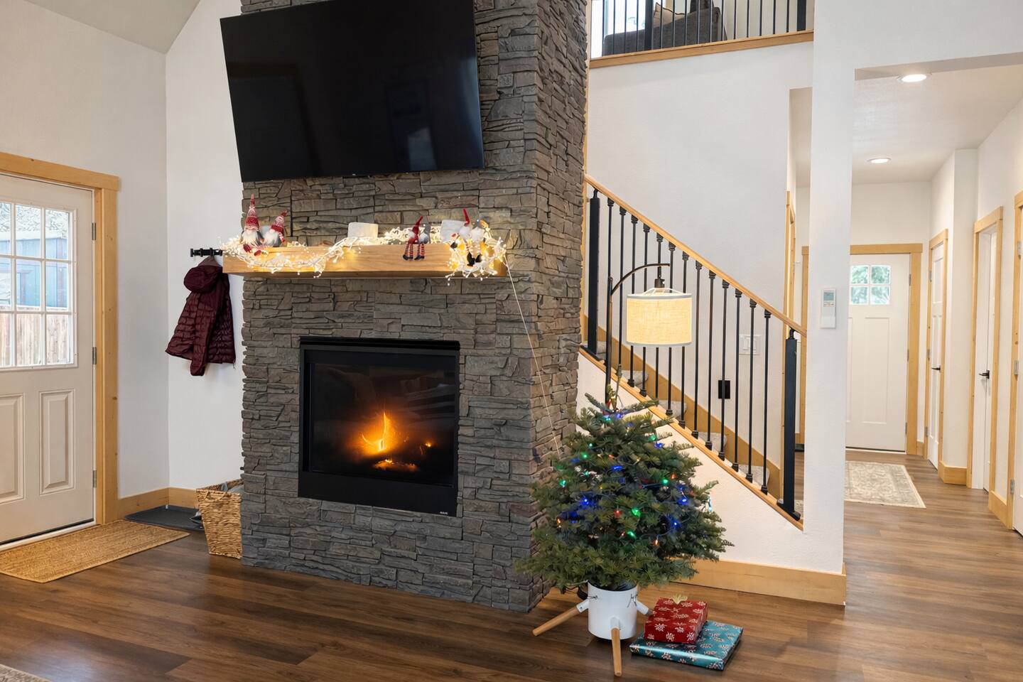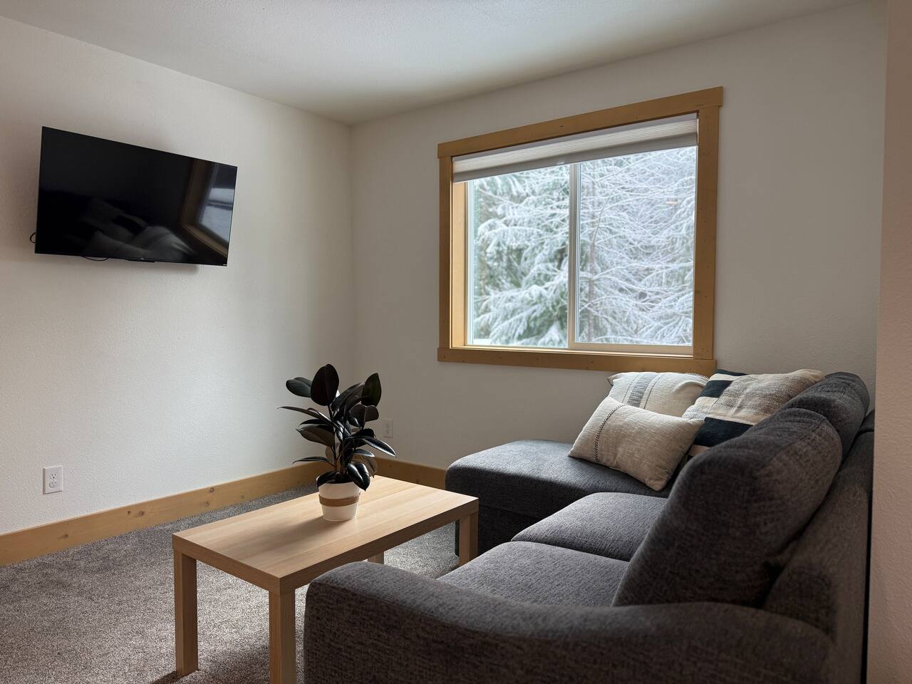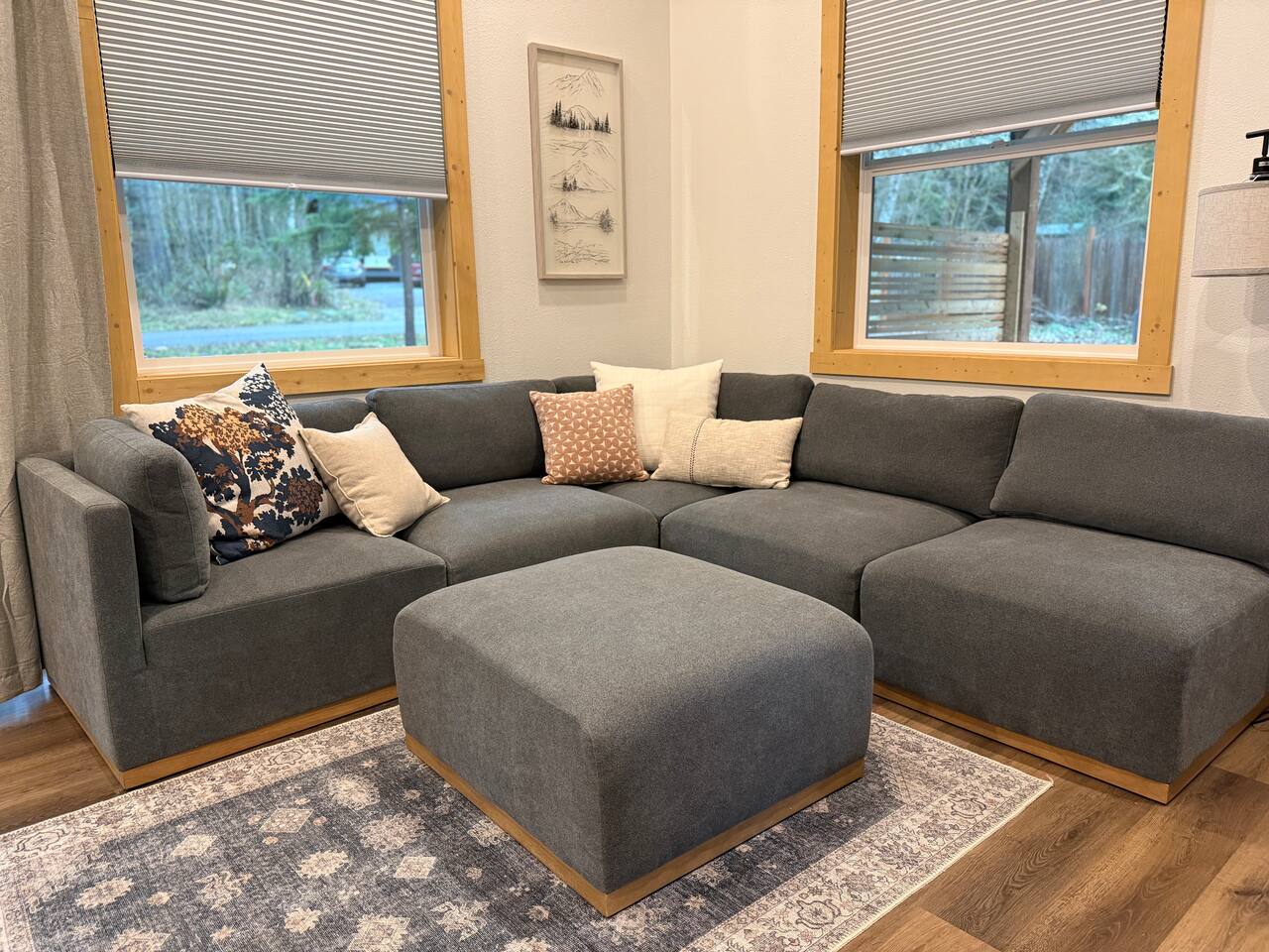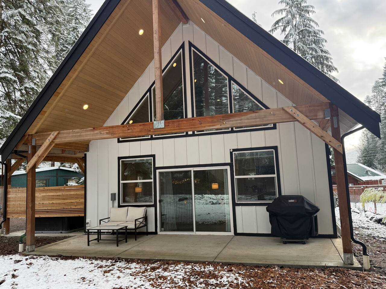 Escape to this elegant, modern cabin just 5 miles from Mt Rainier National Park where comfort and tranquility meet. Relax outdoors year-round with a covered hot tub, cozy fire pit, propane BBQ grill and a covered patio warmed by an electric heater—perfect for morning coffee or evening stargazing. It offers a fully equipped kitchen, 2 bedrooms, 2 bathrooms, sleeper sofa, natural light-filled interior, washer/dryer and gas fireplace—ideal for a peaceful mountain getaway and year-round adventures.
