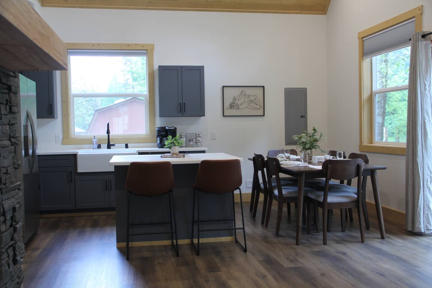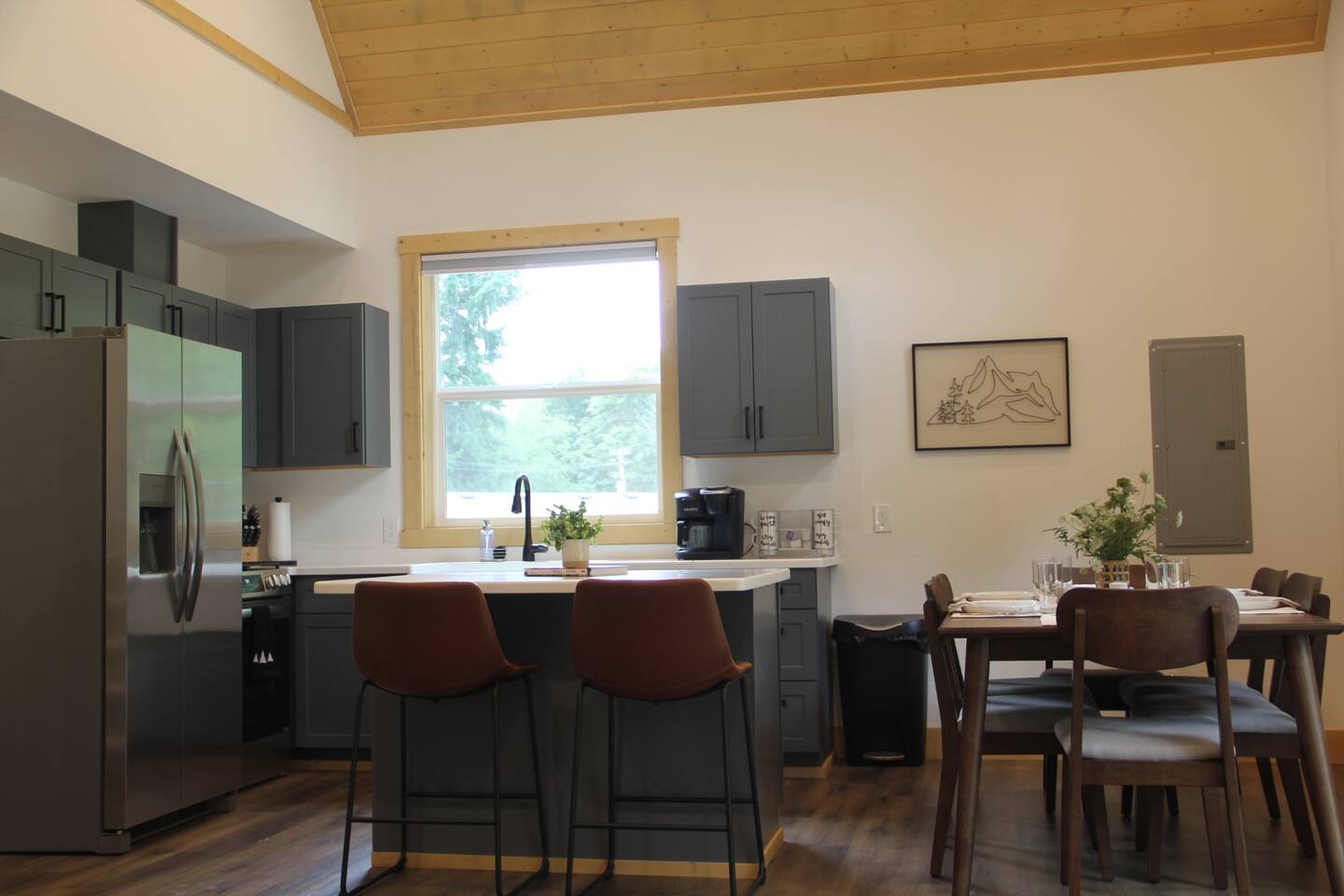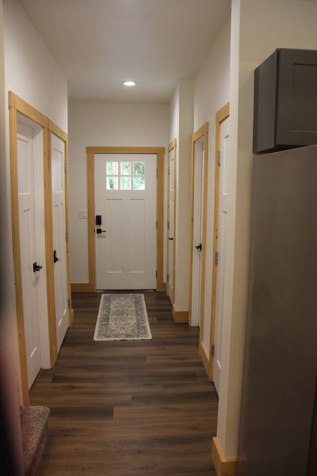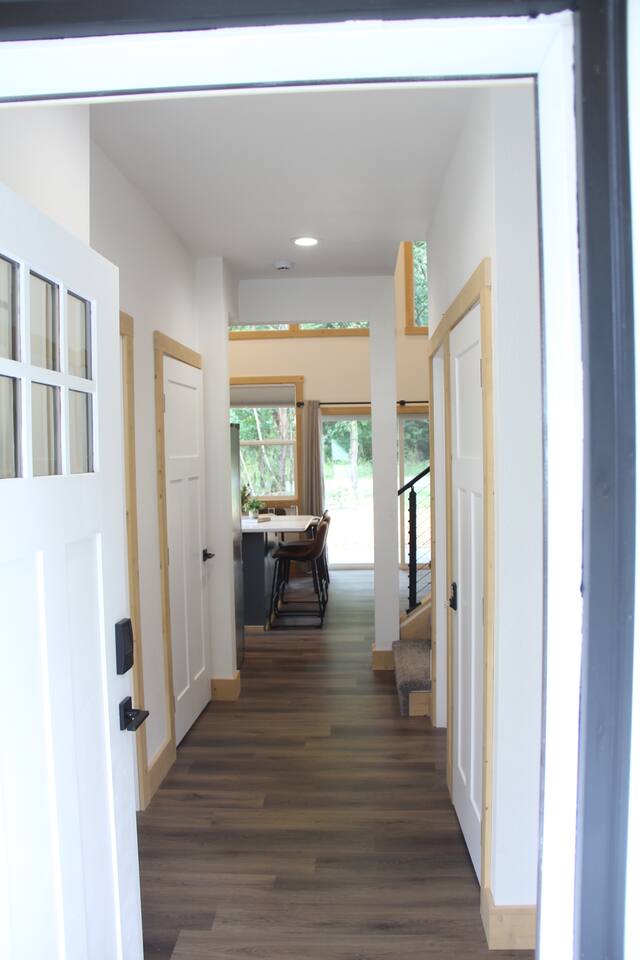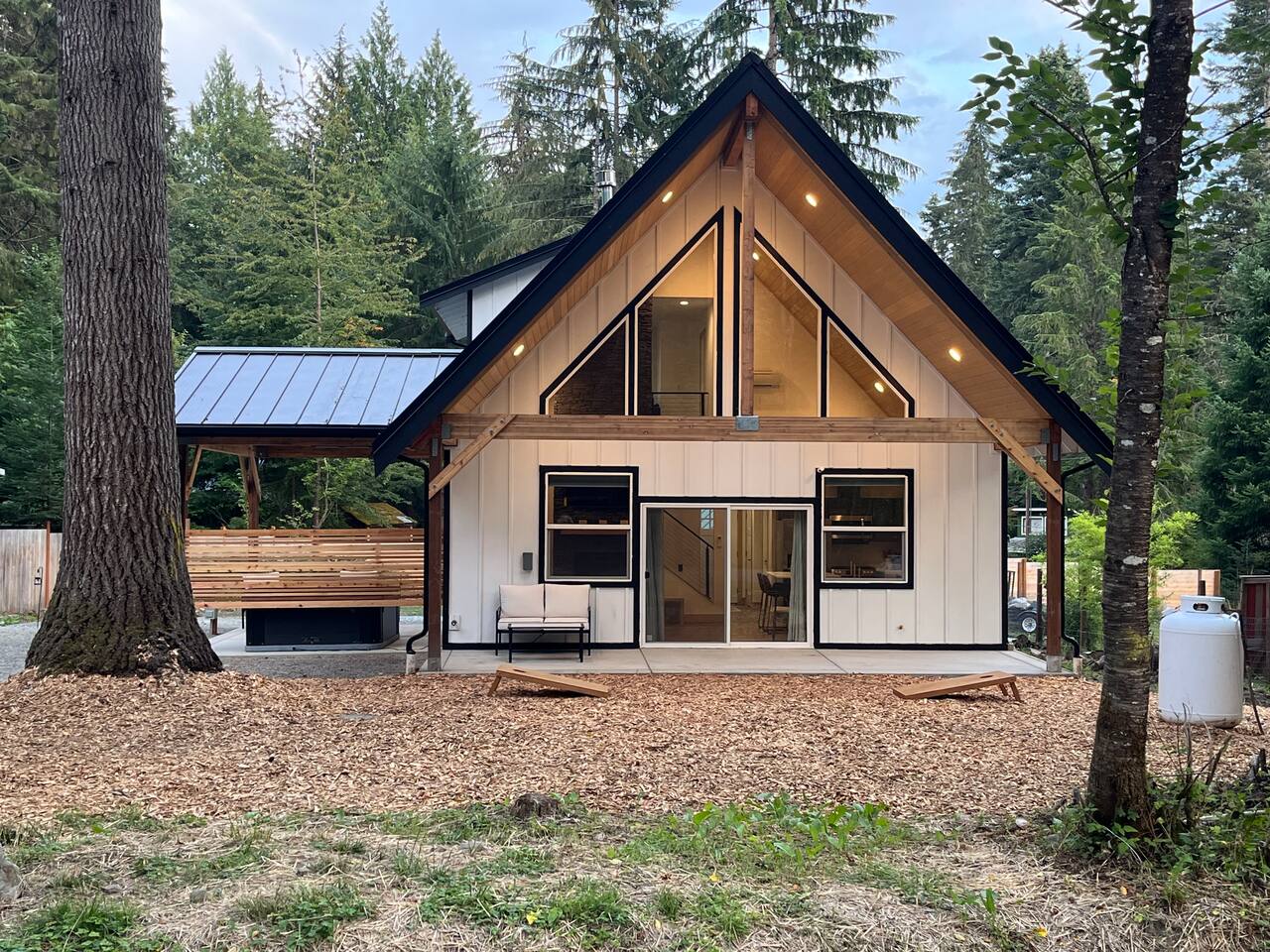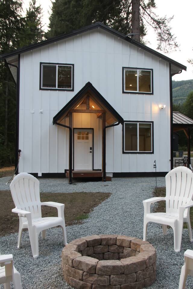 Escape to this elegant, modern cabin just 5 miles from Mt Rainier National Park where comfort and tranquility meet. Relax outdoors year-round with a covered hot tub, cozy fire pit, propane BBQ grill and a covered patio warmed by an electric heater—perfect for morning coffee or evening stargazing. It offers a fully equipped kitchen, 2 bedrooms, 2 bathrooms, sleeper sofa, natural light-filled interior, washer/dryer and gas fireplace—ideal for a peaceful mountain getaway and year-round adventures.